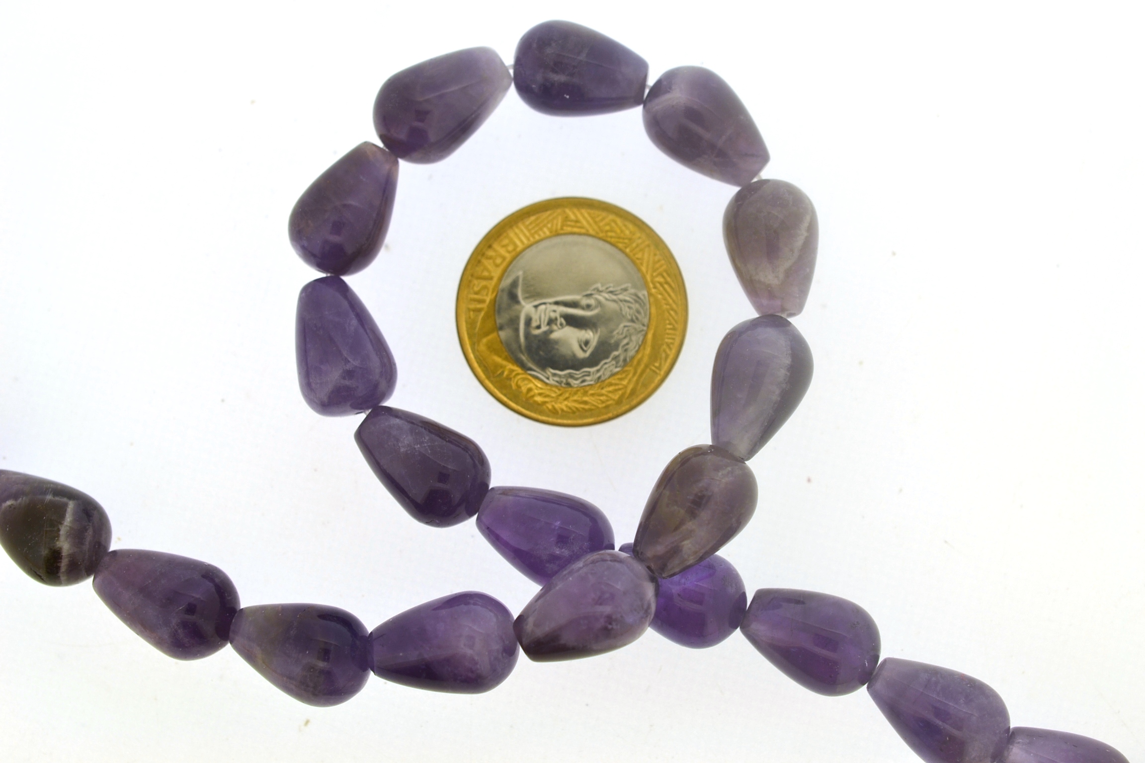PRODUTO NATURAL. Pedra Ametista entremeio gota (furo passante vertical - por dentro da peça, de cima para baixo), medindo cerca de 15 x 11 mm cada uma. Furo aproximadamente 1 mm.