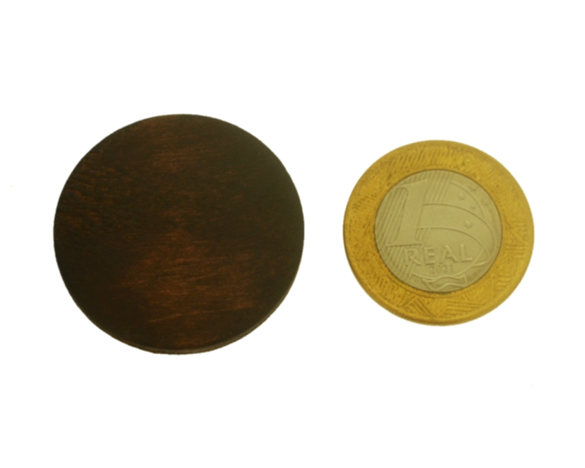 Disco madeira preto com 1 furo na transversal, medindo 40 x 4 mm.