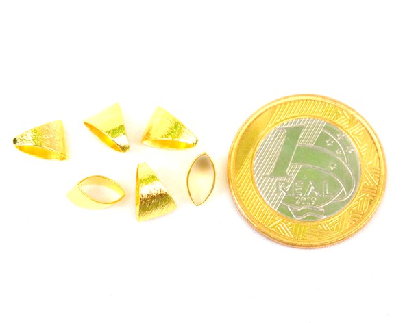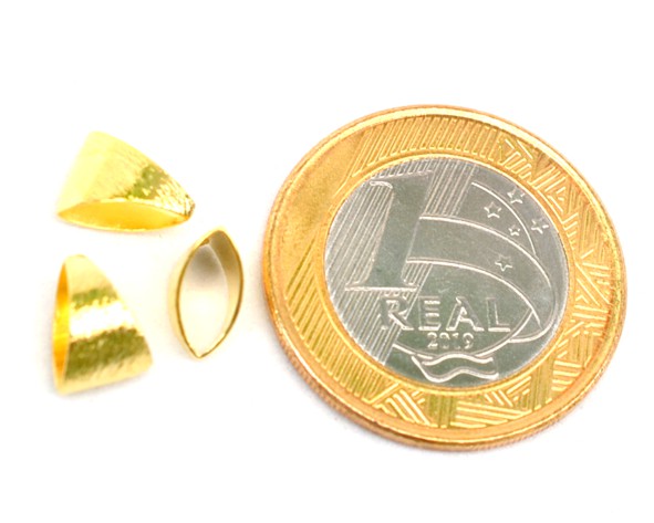 Entremeio triangular lixado banhado a ouro 18k, medindo 9.4 x 7 x 5 mm.