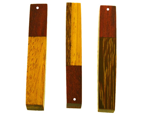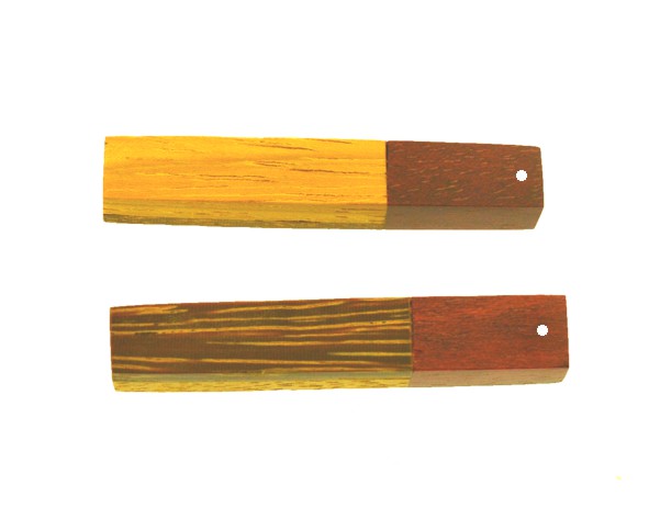 Pingente feito com madeiras exclusivas marchetadas (sucupira rajada, pau amarelo e loro vermelho), medindo cerca de 4.9 x 0.7 cm.