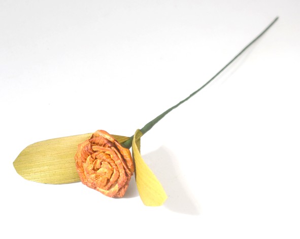 Flor feita artesanalmente com fibra natural de palha de bananeira. Tem haste de arame flexível e revestido com fita floral verde. A haste com a flor mede cerca de 30 cm de comprimento. A flor mede aproximadamente 5 cm de diâmetro. Preço por unidade.