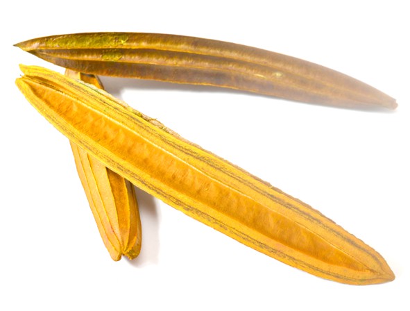 Casca natural sete-sangrias (sem furos), muito usada para diversos tipos de artesanatos, arranjos e decorações. A casca é longa e levemente curvada, lembrando o formato de uma canoa, mais estreita. A parte de fora da casca tem estrias, que lembram a textura de uma carambola. Varia entre 14 cm e 23 cm de comprimento cada uma.