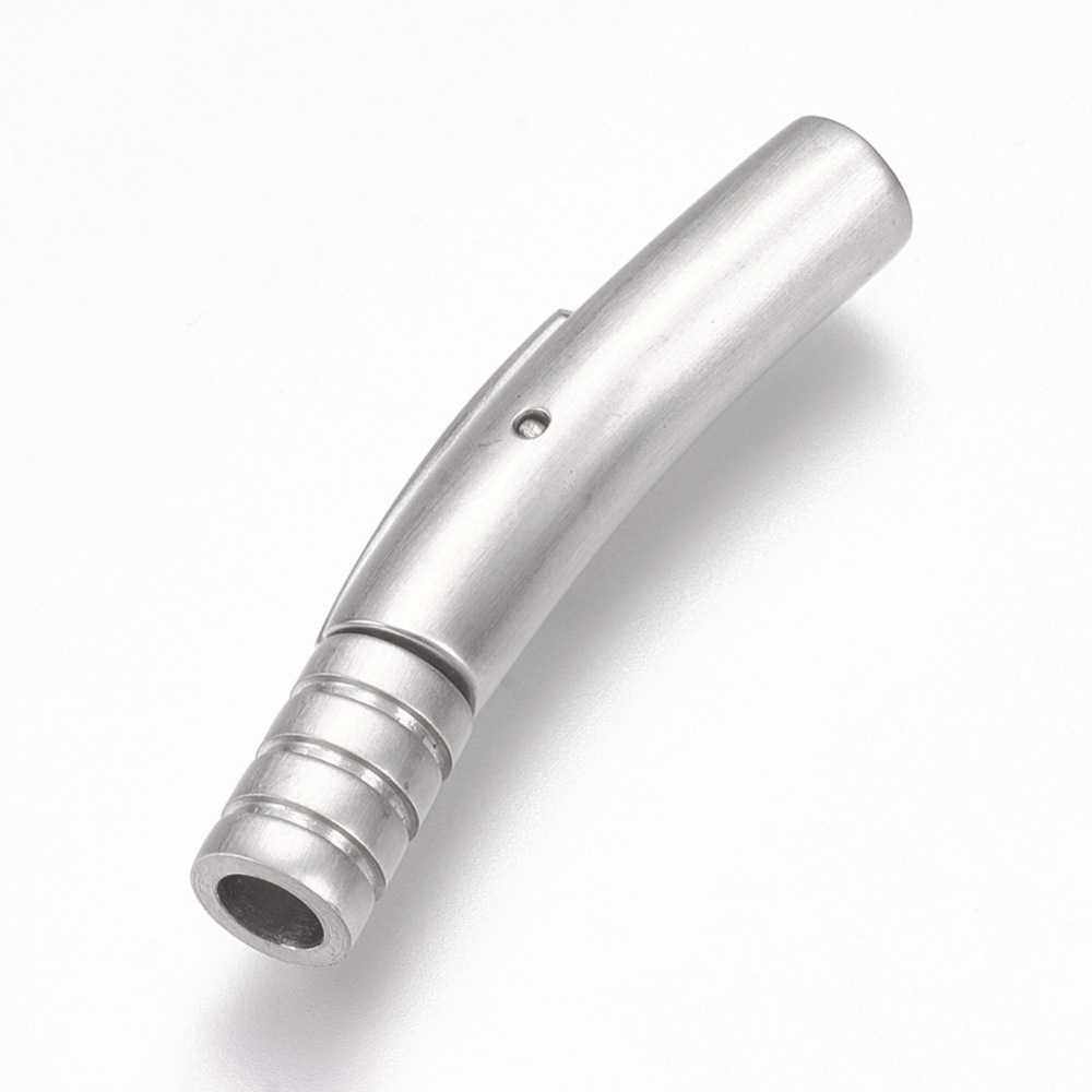Fecho de encaixe redondo para pulseiras (masculinas e femininas) em aço inox. Mede 29 x 5 mm (externo). Medida do furo: 3 mm Fácil de usar. Resistente e muito bonito. Preço por unidade.