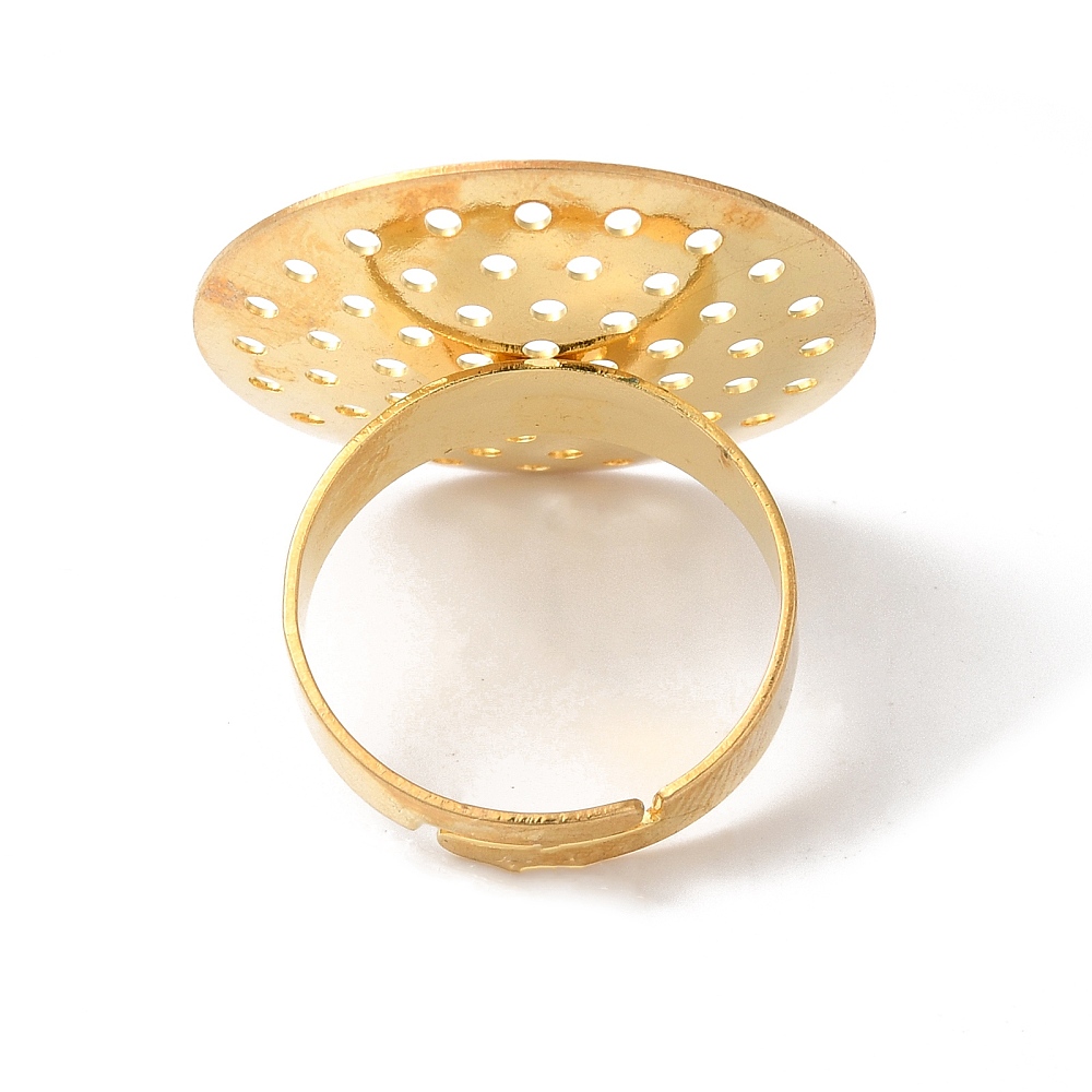 Base de anel regulável em aço inox dourado. Diâmetro interno: 18 mm. Medida da base: 25 mm. Espessura: 5 mm. Preço por unidade.