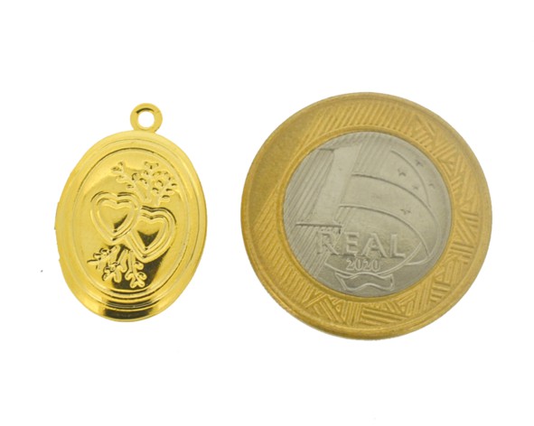 Pingente relicário oval com detalhe de flores gravadas, banho ouro 18k. Mede 24x16 mm. Excelente acabamento.