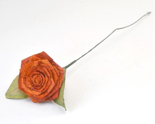Flor feita artesanalmente com fibra natural de palha de bananeira. Tem haste de arame flexível e revestido com fita floral verde. A haste com a flor varia entre 30 e 40 cm de comprimento. A flor mede aproximadamente 10 cm de diâmetro. Preço por unidade.