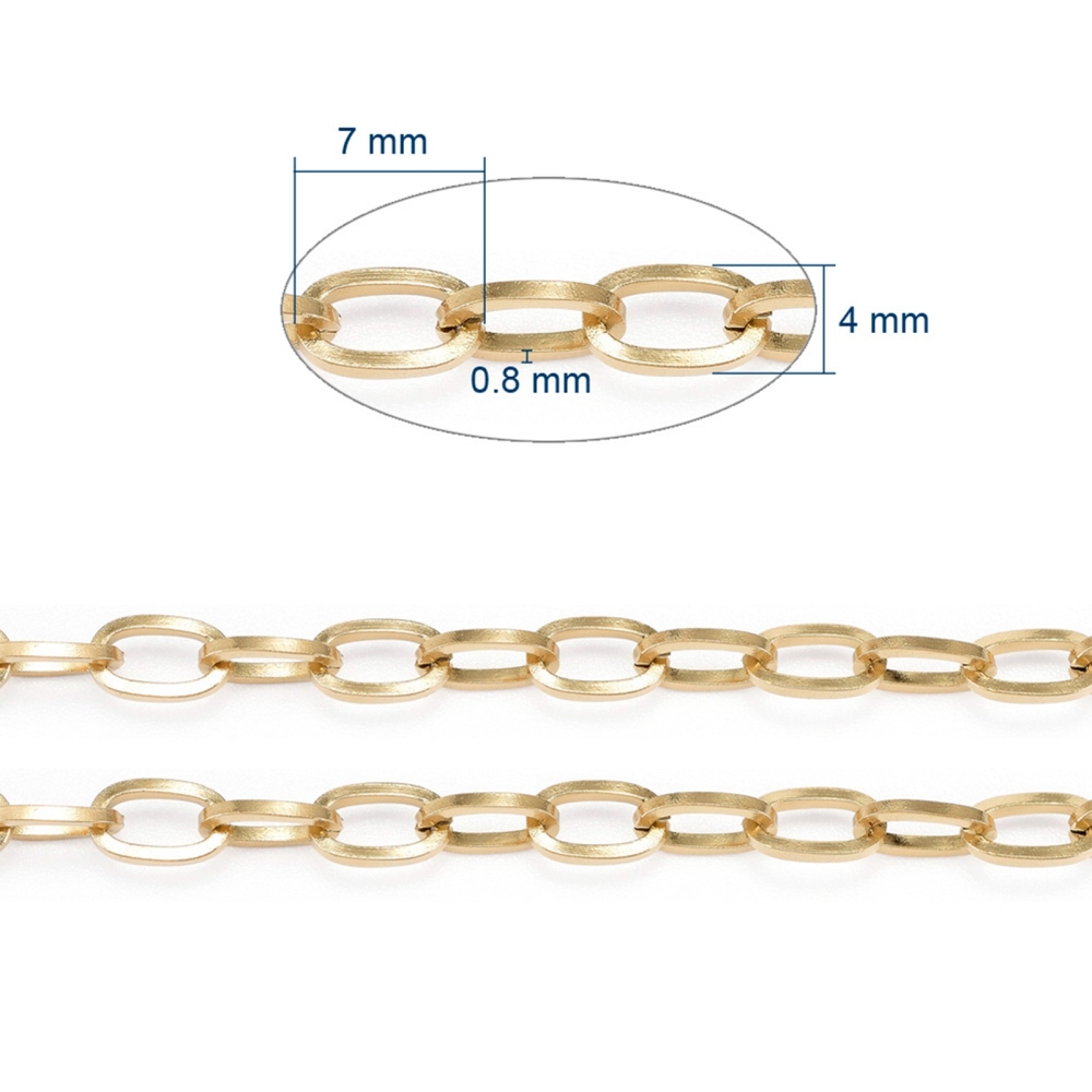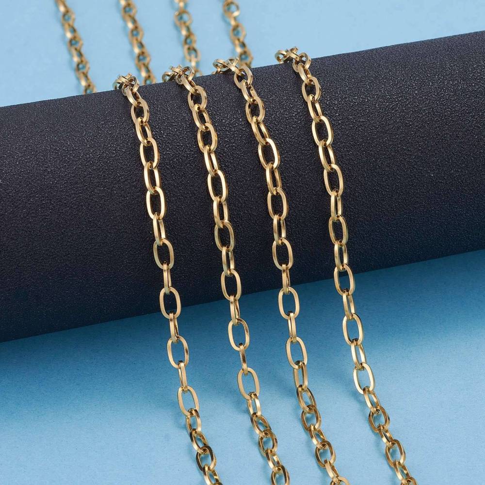 Corrente de aço inoxidável 304 dourada, montada com fecho lagosta, comprimento (aberta) 60 cm e chapeamento a vácuo com IONS. Os elos da corrente são ovais medindo aproximadamente 2 X 1,5 x 0,3mm.