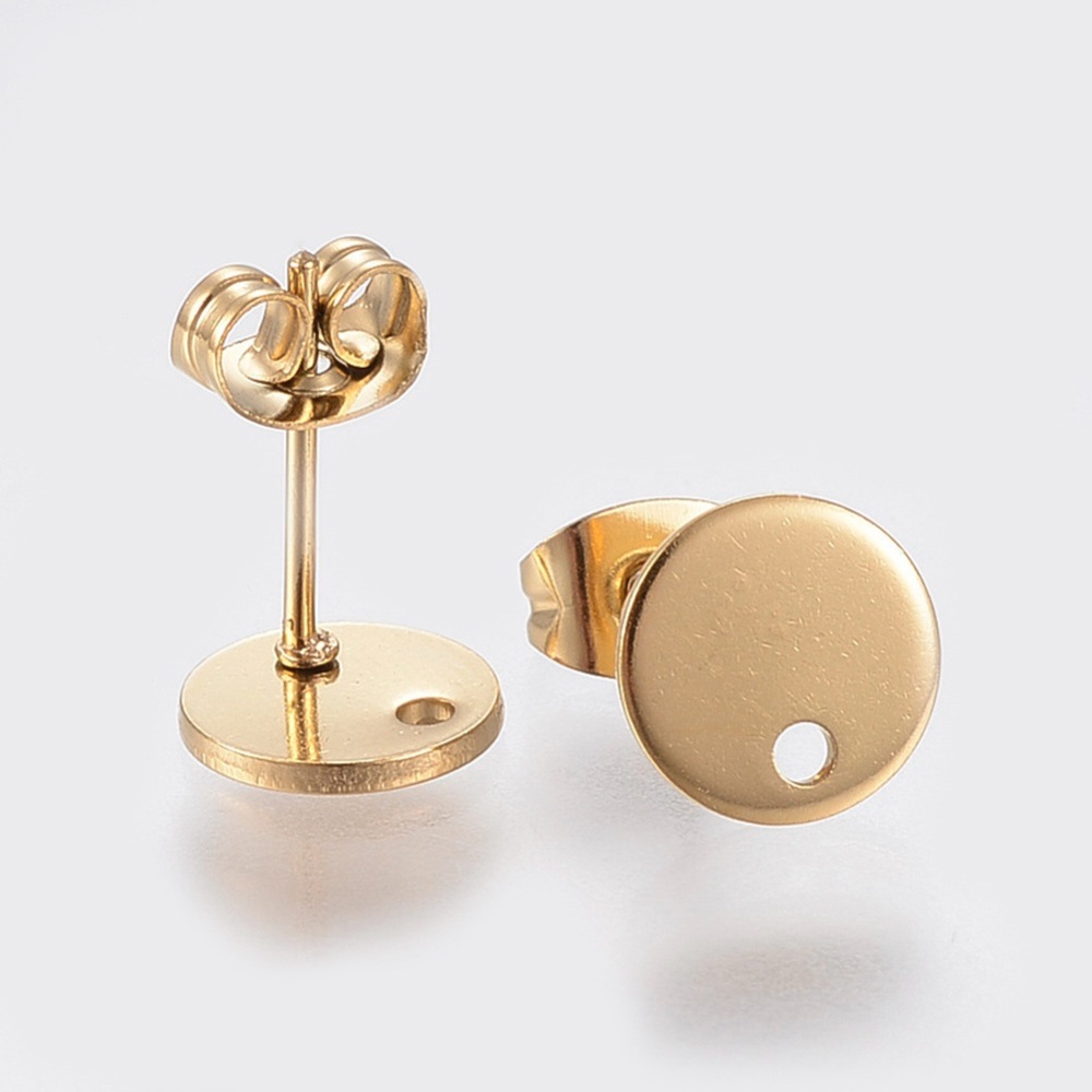 Brinco redondo em aço inoxidável 304, para joias, biojoias, semijoias e bijuterias. Tamanho: cerca de 10 mm de diâmetro, 1 mm de espessura, furo: 1,5 mm; pino: 0,8 mm.