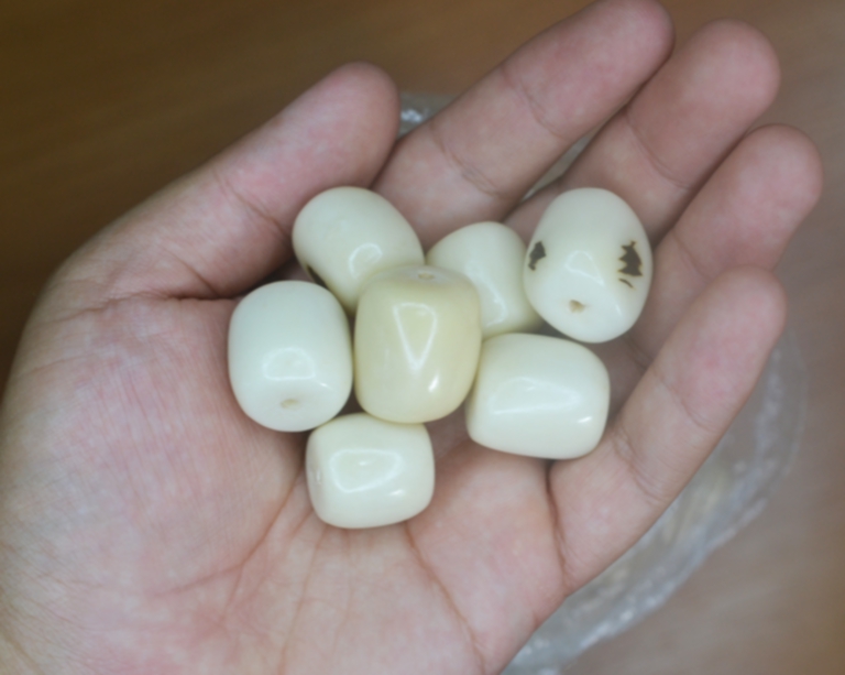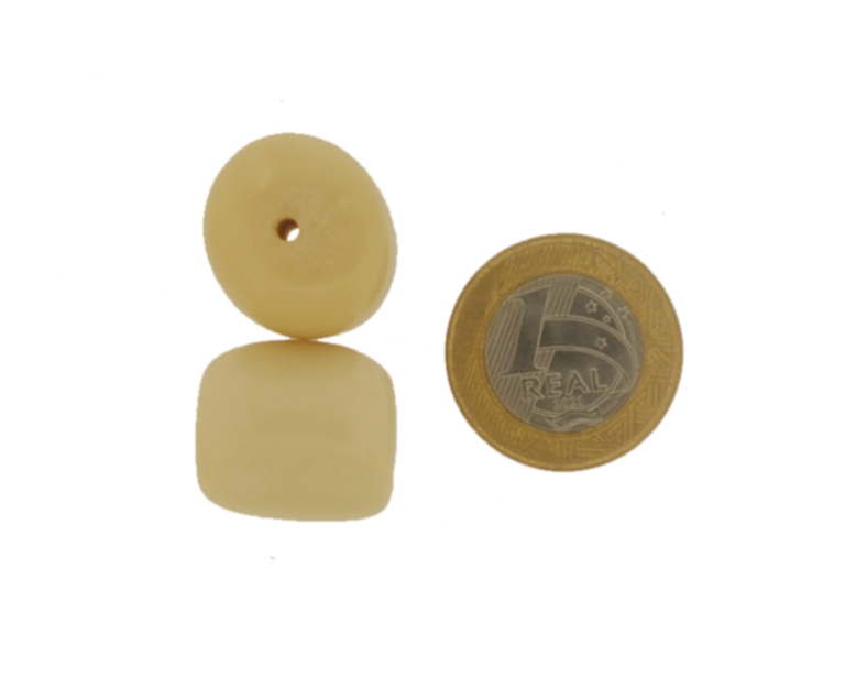 Semente de jarina branca (natural), em formato de cilindro, com furo trabnsversal na vertica (passa pode dentro da peça, de cima para baixo). O tamanho varia entre 2.5 a 4.5 cm de comprimento e, em média, 2 cm de espessura (pode variar para mais ou para menos).