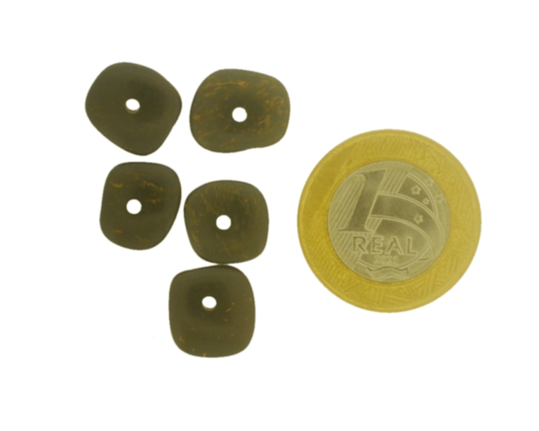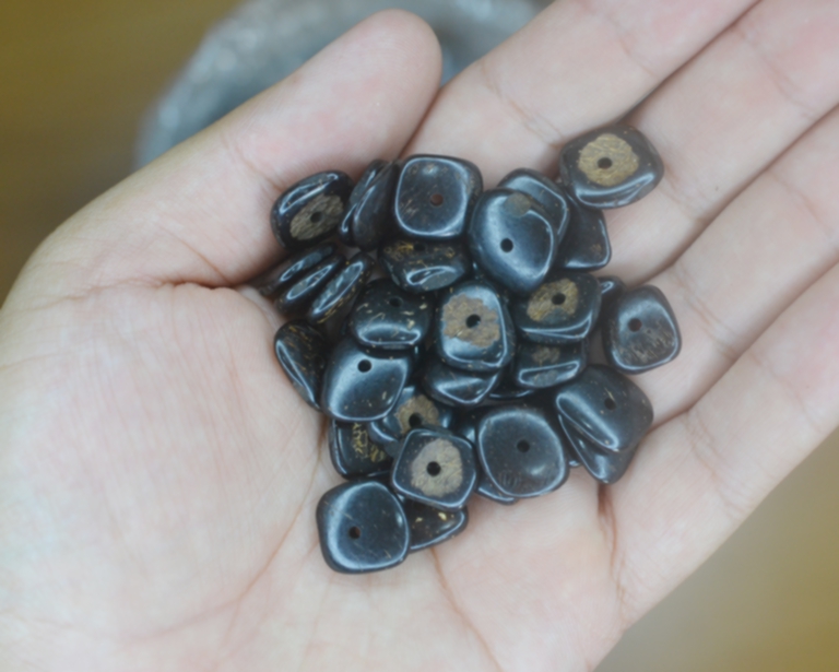 Cascalho de coco tucumã com furo central, com tamahos que variam entre 1 e 2 cm cada um.