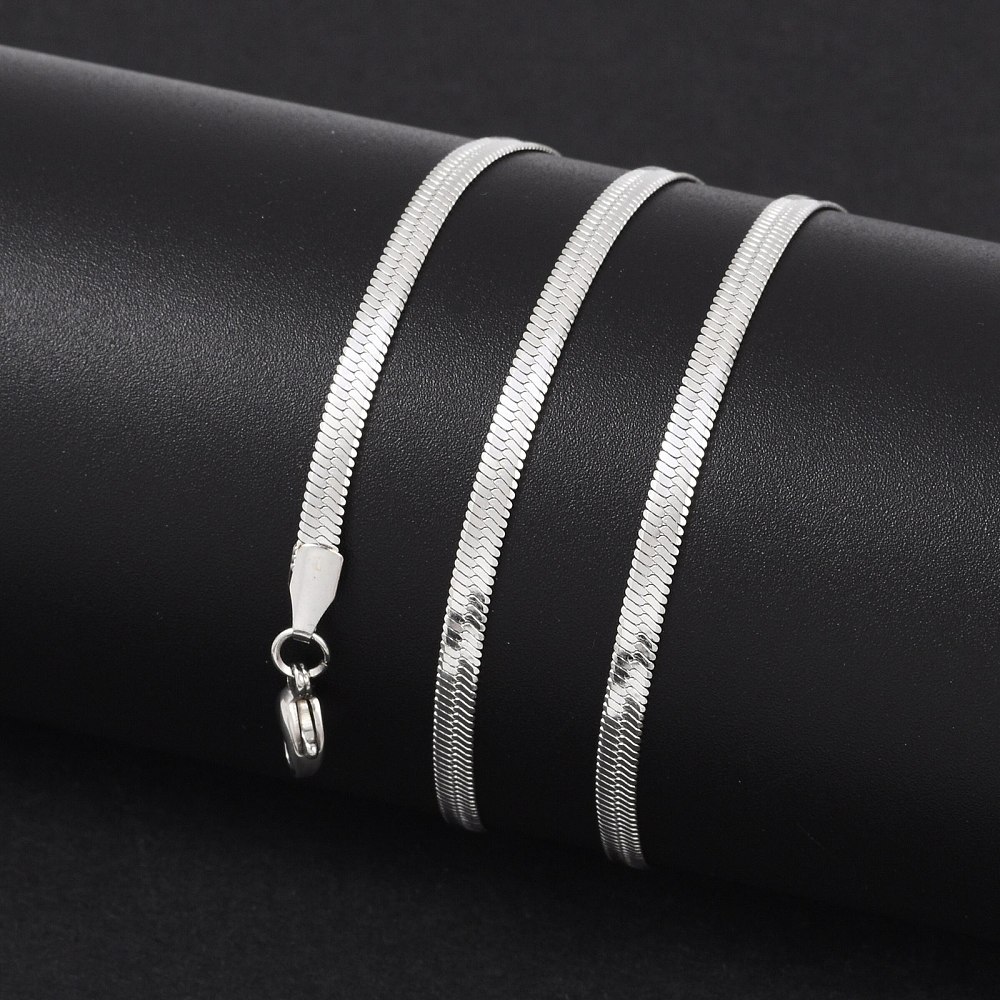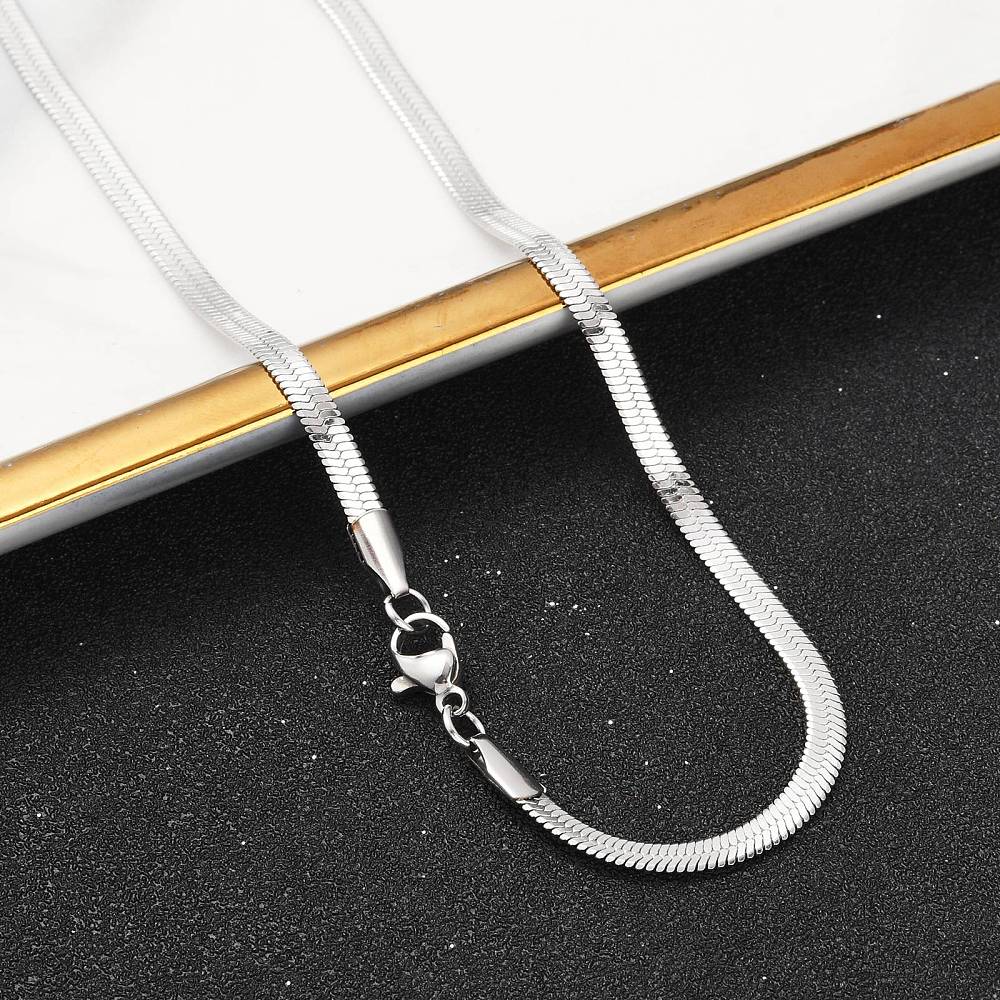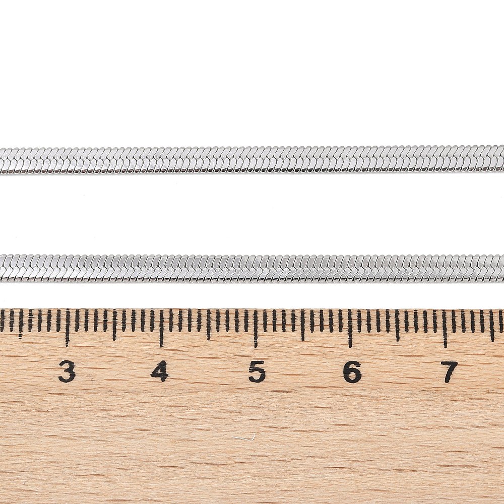 Corrente montada, modelo rabo de cobra (chato), em aço inox 304. Mede 45 cm de comprimento (aberta). Cerca de 3 mm de largura x 0.6 mm de espessura.