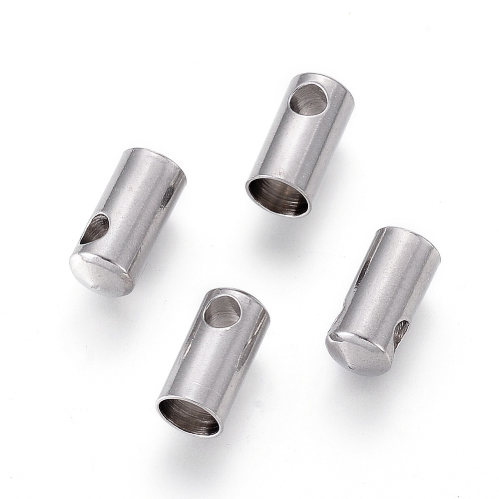 Terminal/ponteira em aço inox, para fios roliços de até 4 mm de espessura. Mede 9.5x4.5 mm. Tamanho do furo é de cerca de 2 mm.
