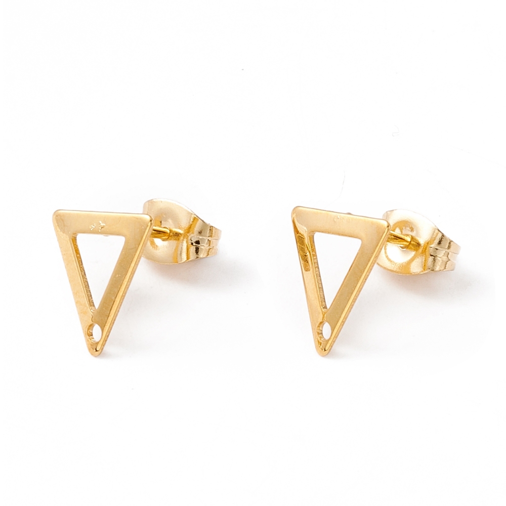 Base para brincos em aço inox dourado, modelo triângulo vazado. Mede 10x9 mm. Acompanha tarraxa de silicone (tarraxa de inox dourado da foto é ilustrativa - vendida separadamente).