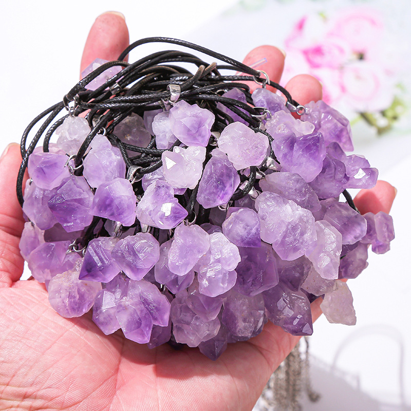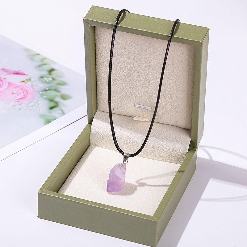 Colar/chocker pronto (montado) em cordão de cor preta, com pingente de pedra natural de ametista (tipo bruto) - mede entre 1.5 cm e 2 cm, aproximadamente. Acabamento da peça em metal prateado. Mede 45 cm (fechado) e tem corrente alongadora de 5 cm (podendo chegar a 50 cm fechado).